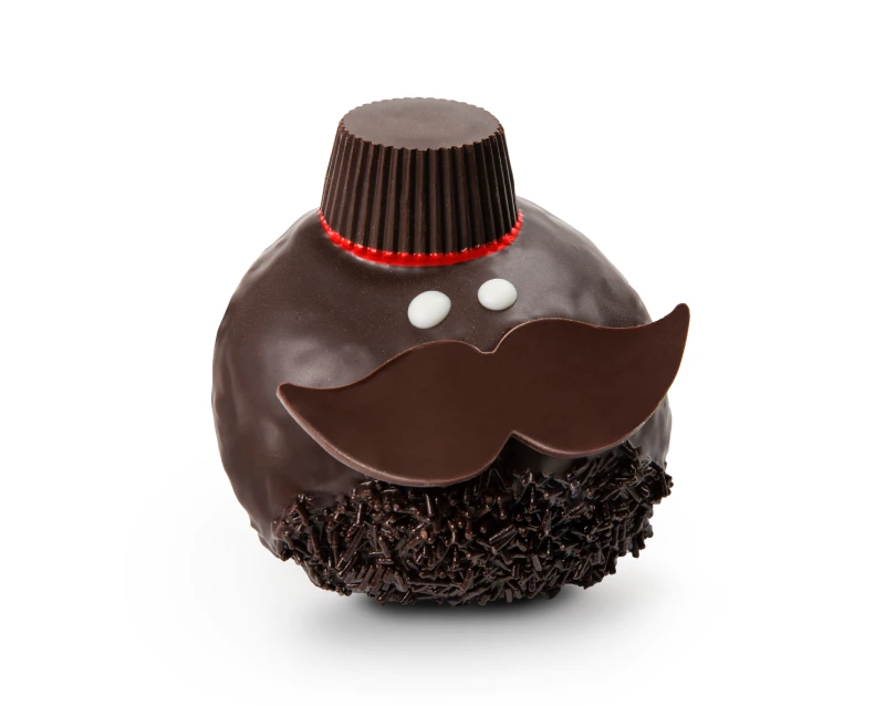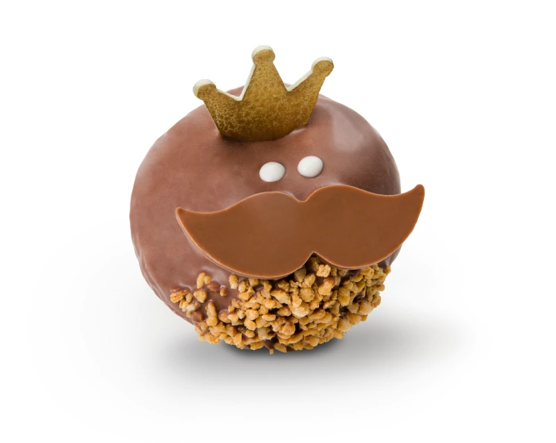 Gaspar es el pelirrojo! Está bañado en choco milk y relleno de cremoso Nutty (crema de cacao y avellanas). Luce una barba de crujiente cacahuete caramelizado, un bigote de choco milk y una corona de choco blanco.