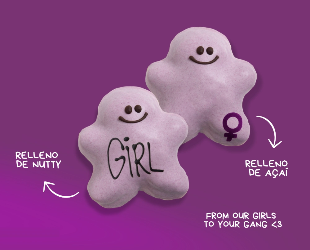 Boldugirl de masa tierna bañada en chocolate blanco coloreado lila. Relleno de Nutty (crema de choco negro y avellana).