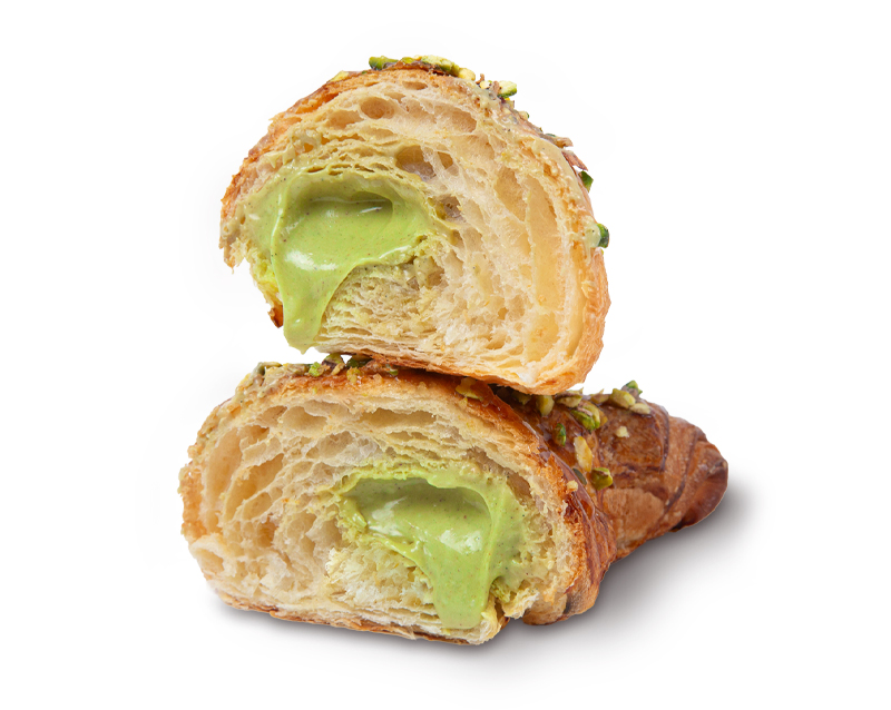 Nuestra última incorporación sweet: un delicioso croissant de pistacchio, elaborado con masa hojaldrada, relleno de nuestra deliciosa crema de pistacho, y con un acabado crunchy de granillo por encima.